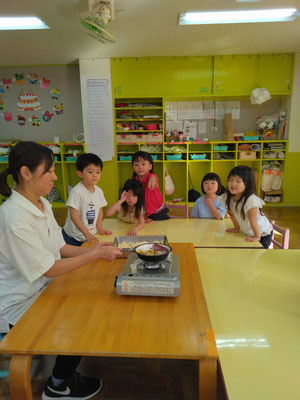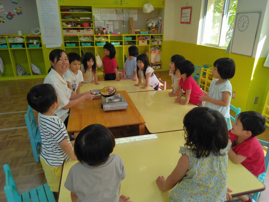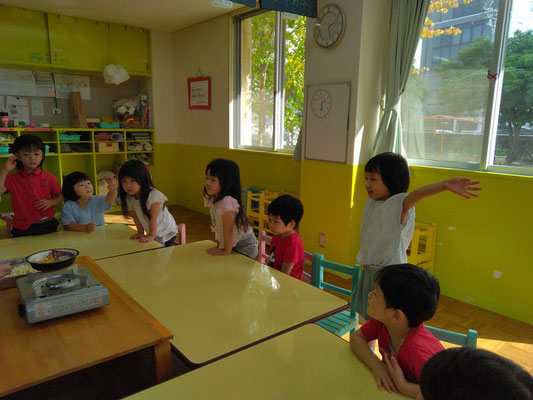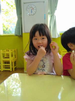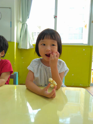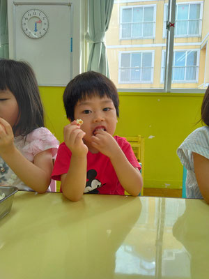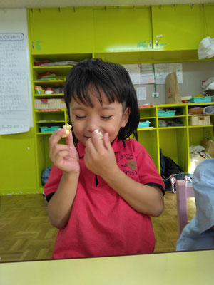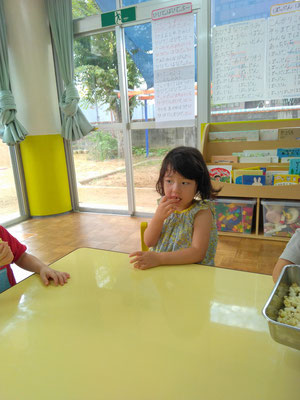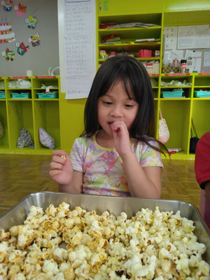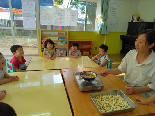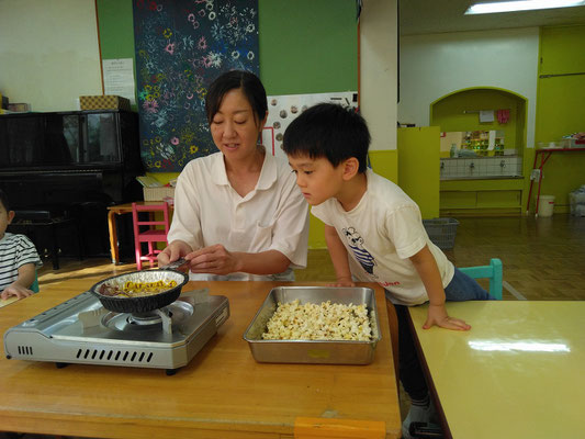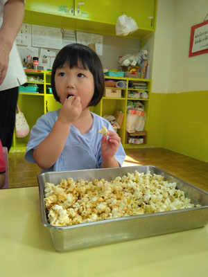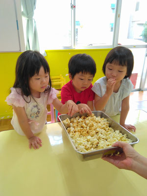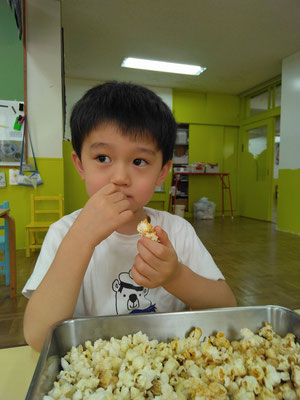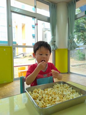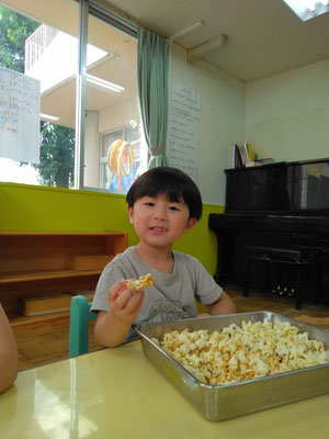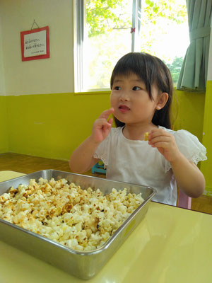 10月 07日, 2025年 ポップコーン 【年少組】 3時のおやつ前に、ポップコーンを作りました。 粒が音を鳴らし始めると、「ポップン♪」「ポップポップポップコーン♬」と弾ける音を聞きながら、歌をうたい始めた子どもたちでした。 「いいにおーい」「甘い匂いもするけど、焦げた匂いもするよねー」と言いながら、美味しくいただきました。 tagPlaceholderカテゴリ: